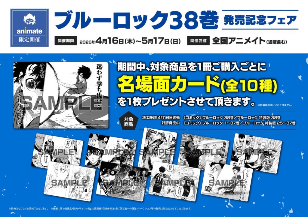スポンサーリンク 「ブルーロック38巻」発売記念フェア 未分類 X Facebook はてブ LINE コピー 2026.03.30 詳細はこちらから ▽ アニメイト 対象商品ご予約はこちらから ▽ アニメイト ○対象商品■2026年4月16日(木)発売[コミック]・ブルーロック 38巻・ブルーロック 特装版 38巻 ■好評発売中[コミック]・ブルーロック 1~37巻・ブルーロック 特装版 25~37巻